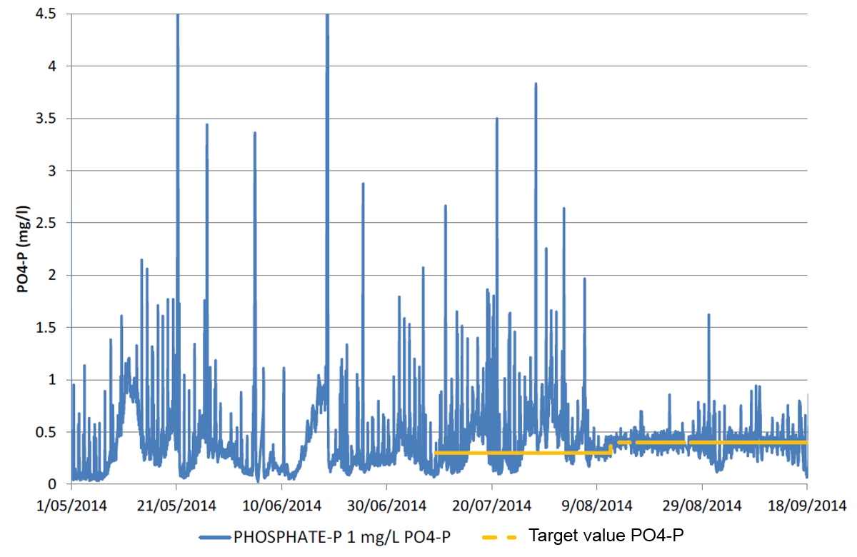 The second system analyzed is the Utrecht wastewater treatment plant. Data from this system is shown in Figure 2. Sensor technology was implemented to better control alum and iron dosing, in order to achieve a more stable effluent quality from which valuable resources such as phosphorus can be recovered. Figure 2 shows that the implementation of P-sensors and a sensor controlled dosing regimen of metal salts significantly reduced the effluent variability.