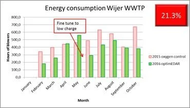 Data from the Wijer wastewater treatment plant in Belgium is shown in Figure 1. Management at this facility implemented dissolved oxygen sensors to enable sensor-controlled aeration of the active sludge treatment step instead of following a time-controlled regime. Whenever dissolved oxygen levels dropped below a certain threshold value, the blowers were started to increase the amount of oxygen for the bacterial treatment process. As a result, the number of blower hours necessary to adequately aerate the treatment process could be reduced significantly, leading to a savings of more than 20 percent in energy costs. The aeration in the activated sludge process can be responsible for up to 60 percent of the total plant energy consumption (Source: EPA.gov). The energy savings that can be achieved by improved DO control depends on the plant loading characteristics, plant configuration, and the level of instrumentation.